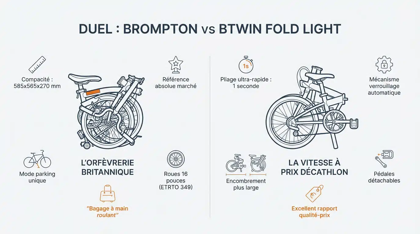 Tout dépend de votre priorité ! Si vous recherchez la compacité absolue pour glisser votre vélo dans les espaces les plus restreints, le Brompton reste la référence incontestée. En revanche, si vous privilégiez la vitesse de pliage et un excellent rapport qualité-prix, le Btwin Fold Light de Decathlon est une alternative très sérieuse qui se verrouille en une seconde seulement.
