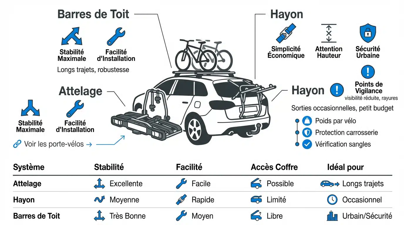 Les systèmes sur toit sont également stables, mais ils dépendent énormément de la qualité de vos barres transversales. Quant aux modèles sur hayon, bien que pratiques, ils peuvent bouger un peu plus sur les routes bosselées à cause de la fixation par sangles. Pour rouler l’esprit tranquille, l’attelage reste la référence.