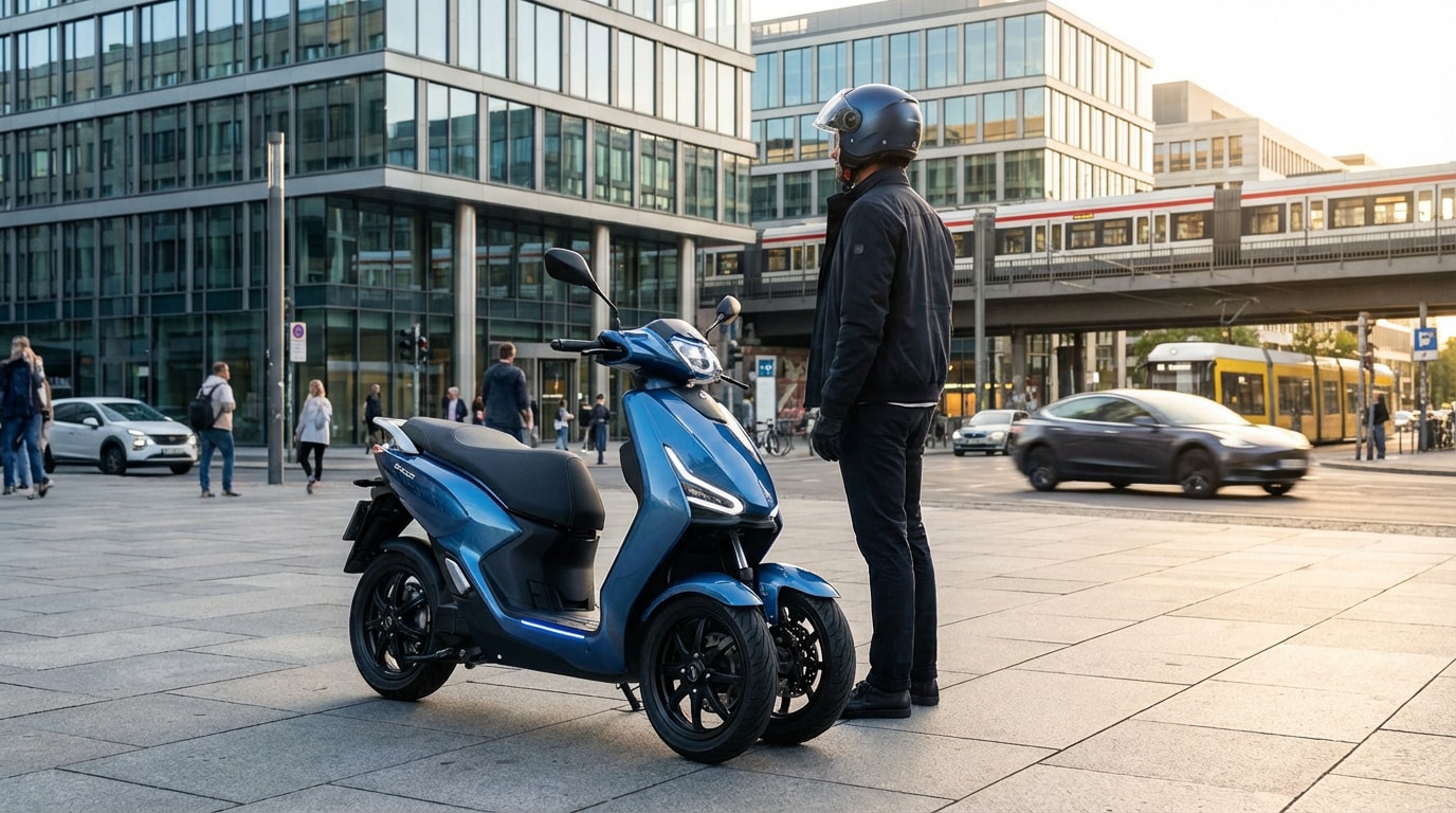 Oui, c’est l’un de ses plus grands atouts ! La présence de deux roues, souvent à l’avant comme sur le Rider 3RS+ ou le Peugeot E-Metropolis, offre une tenue de route bien supérieure, surtout sur sol mouillé ou pavé. Le freinage est également plus efficace grâce aux trois disques qui réduisent les distances d’arrêt sans bloquer les roues.